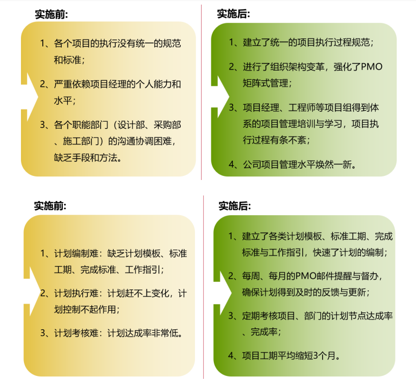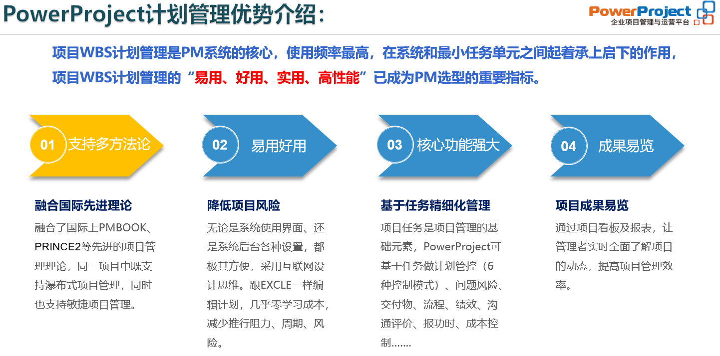 项目管理成功=项目成功,企业的一个个项目成功,公司才会成功,通过项目管理系统及项目管理标准化体系建设,规范了项目管理及执行过程。通过PM项目管理体系可以对外界作出快速响应。项目越早发现问题,越早采取行动,