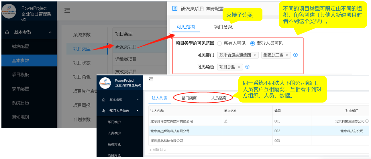 iiProject专注于大型集团企业级项目管理,企业级项目管理主要有以下需求&特点: a).对于大型集团来说,集团下面有不同的分子公司,或不同的事业部,不同的事业部之间项目分类、项目角色、项目管控模式是不一样: