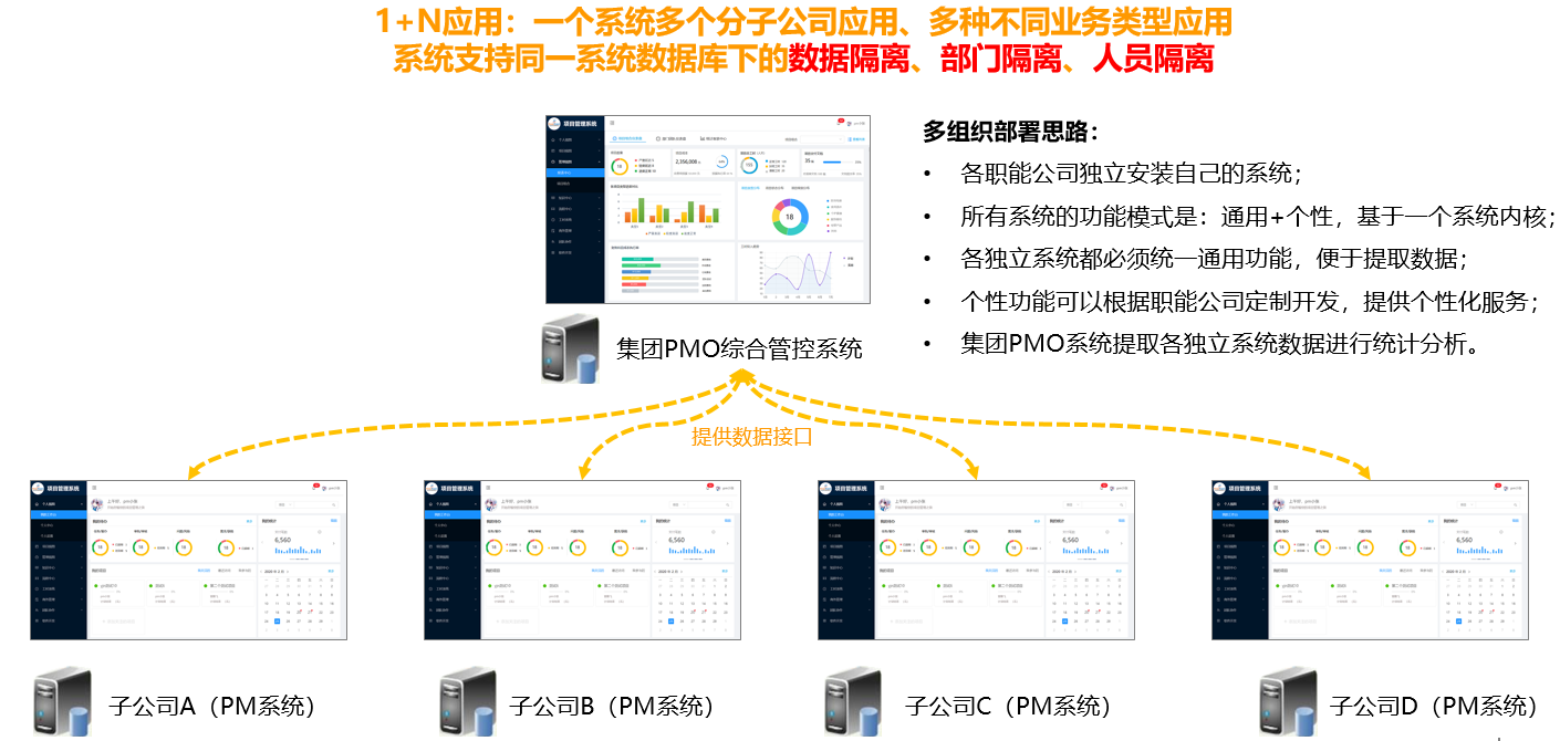 误区:要先做好流程梳理后才上系统       不可否认,企业引入项目管理系统之前,前期能梳理好企业项目的各种数据规范及流程是最理想,包括项目分类、项目角色、权限岗位职责、计划模板、项目命名&编码规则、项目文件夹规范、立项及各种审批变更流程、问题风险流程等。       但在实际中,很多企业的项目管理水平还是比较初级阶段,企业很难在短期内一下子全部梳理出很完整的规范。同时,企业本身的业务及管理水平,甚至管理模式也是处于动态变化之中的,流程和各种规范也是随着企业的发展和需要发生变化的。       所以在我们实际推广应用中,更多的一个做法是先通过系统实施,梳理企业整体的业务流程和规范,通过PM系统及时“落地”并固化这种规范和管理。例如项目计划模板,在iiProject系统中可以设置多计划、前后置关系、各个节点完成条件、绑定流程、项目目录结构及权限、任务完成条件、各个阶段交付物等。这些庞大的管理“体系”, iiProject可以在计划模板中定义阶段、目录结构、目录结构权限、WBS计划、评审流程等。 iiProject支持集团式多组织、多法人、多类型应用: