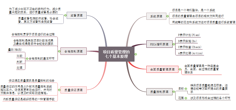 项目质量管理主要可归纳为七大原理,分别为系统原理、PDCA循环原理、全面质量管理原理、质量控制原理、质量保证原理、合格控制原理和监督原理。(详细可见思维导图)