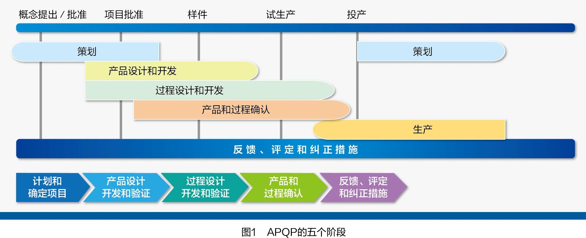 APQP是Advanced Product Quality Planning的简称,中文解释是产品质量先期策划和控制计划。一般分为5个阶段:计划和确定项目,产品设计开发和验证,过程设计开发和验证,产品和过程确认,反馈、评定和纠正措施,如图1所示。这5个阶段也可以结合企业实际,进行局部裁剪调整。